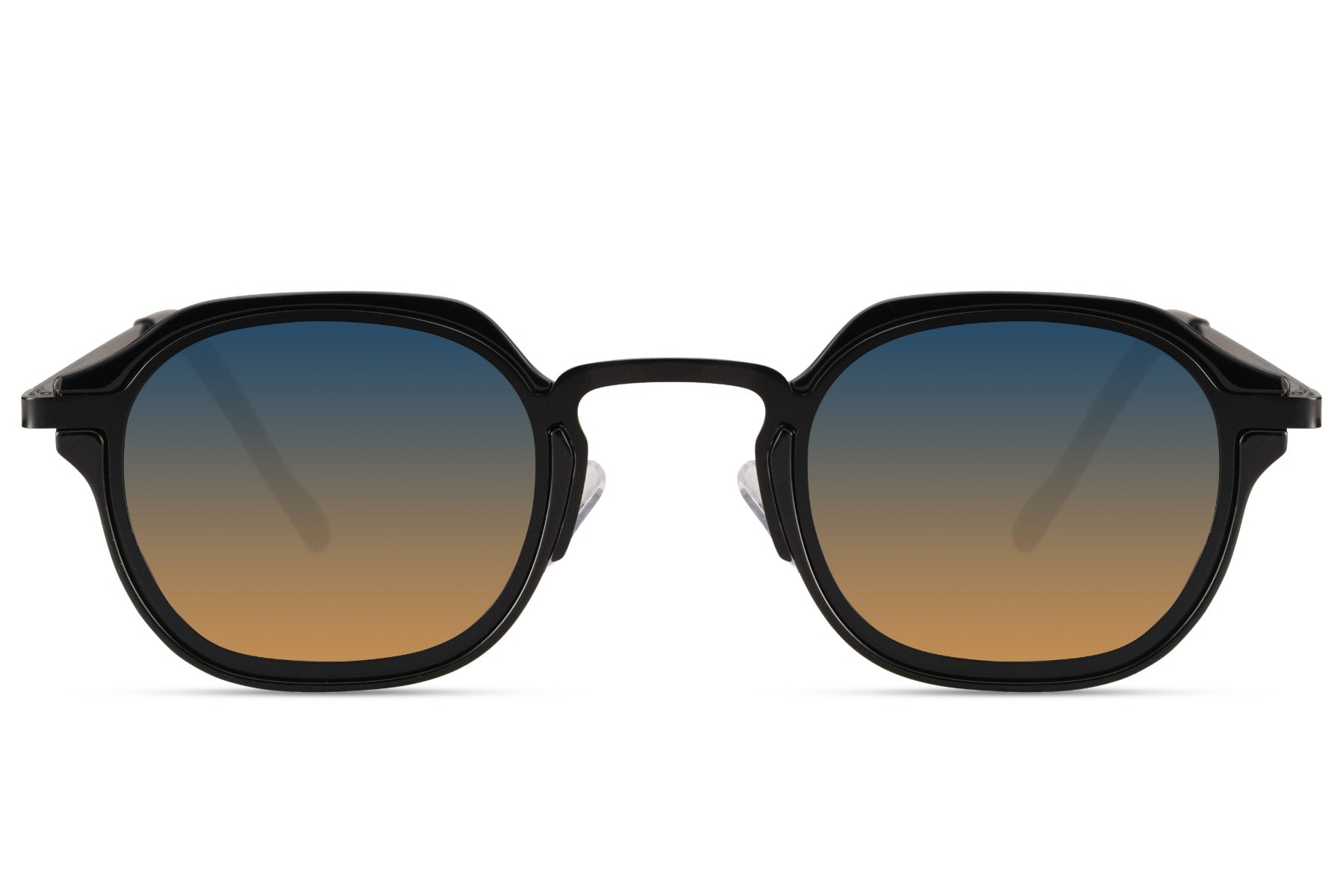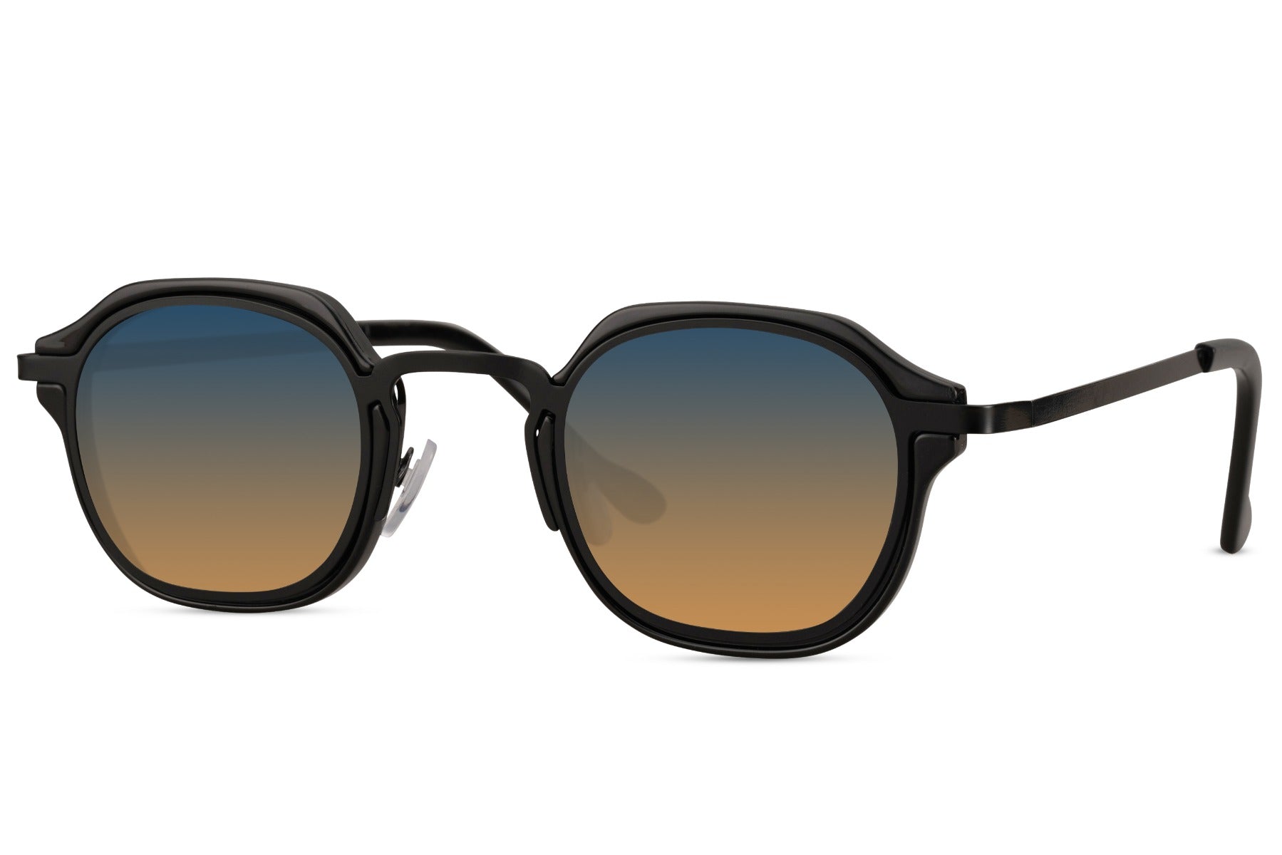 Deze matte zwarte zonnebril met blauwe lenzen heeft een stoere en eigentijdse uitstraling. Gemaakt van koper en polycarbonaat, voorzien van 100% UV-bescherming (categorie 1).
