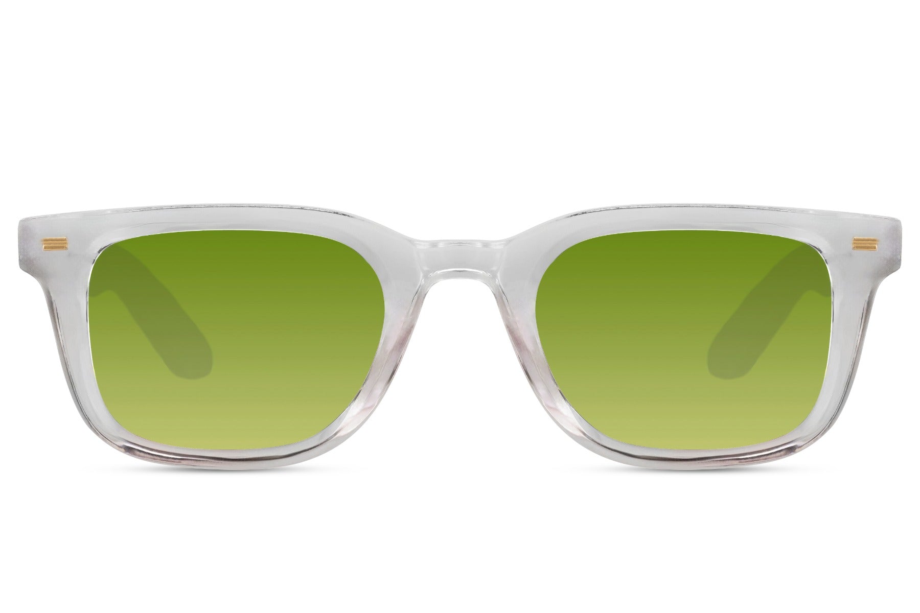 Deze zonnebril heeft een transparant frame met opvallende groene lenzen. Het montuur is gemaakt van 100% gerecycled polyester (rPC) en de polycarbonaat lenzen bieden UV-bescherming (categorie 1).