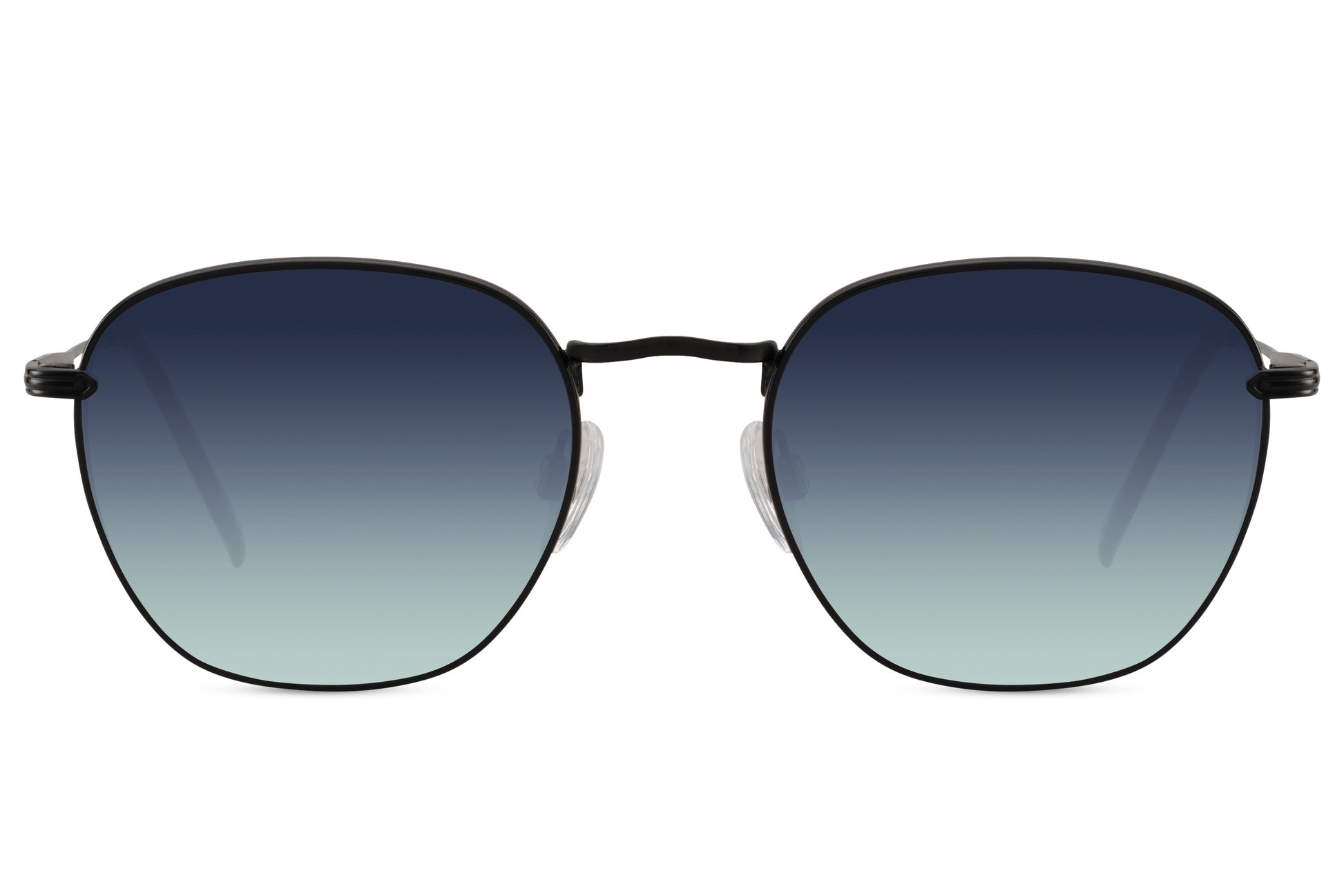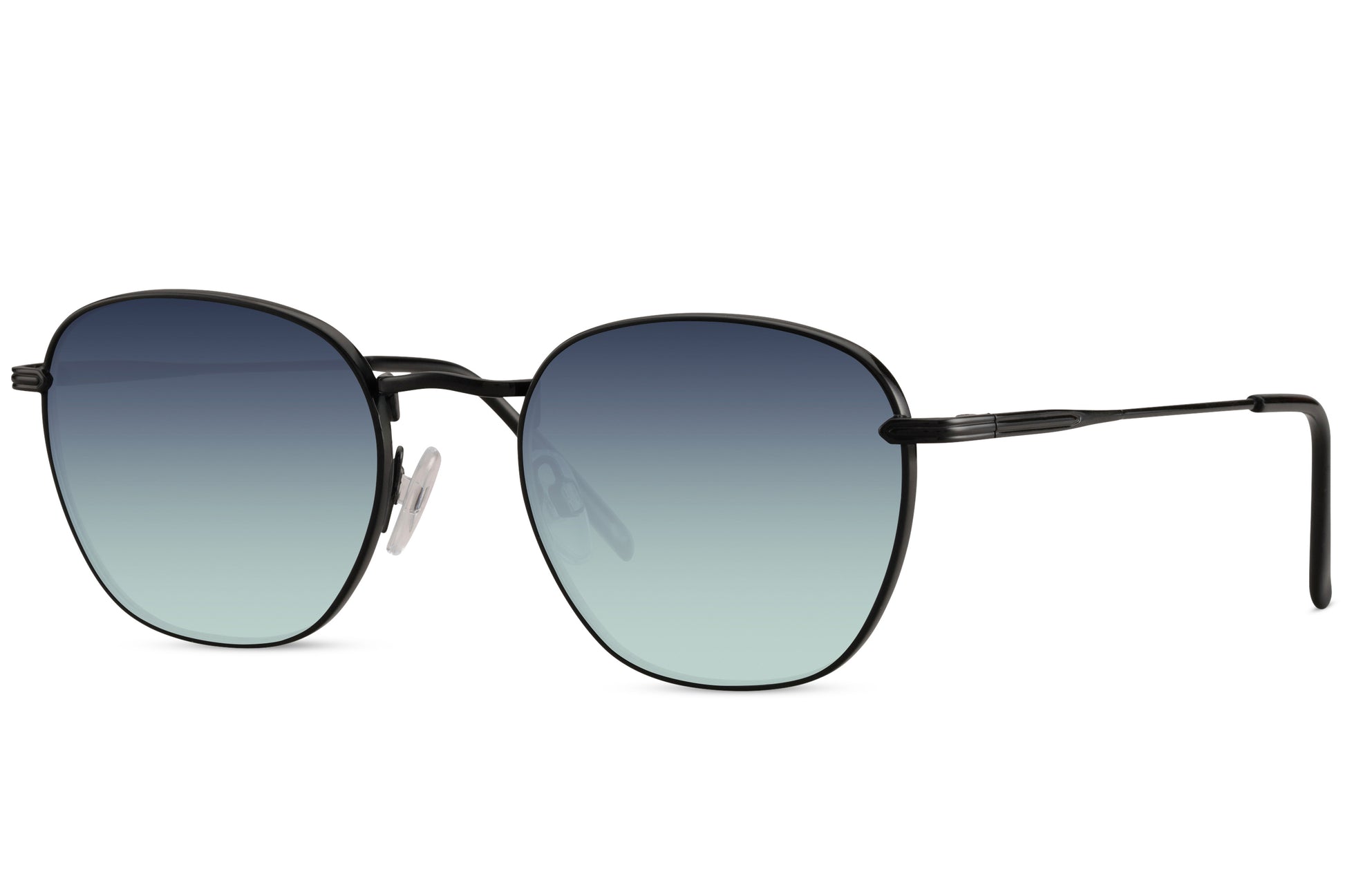 Deze unisex zonnebril heeft een dun, zwart metalen frame met subtiele ronde vormen. De blauwe lenzen van gerecycled rPMMA-L bieden 100% UV-bescherming (categorie 2). Licht,