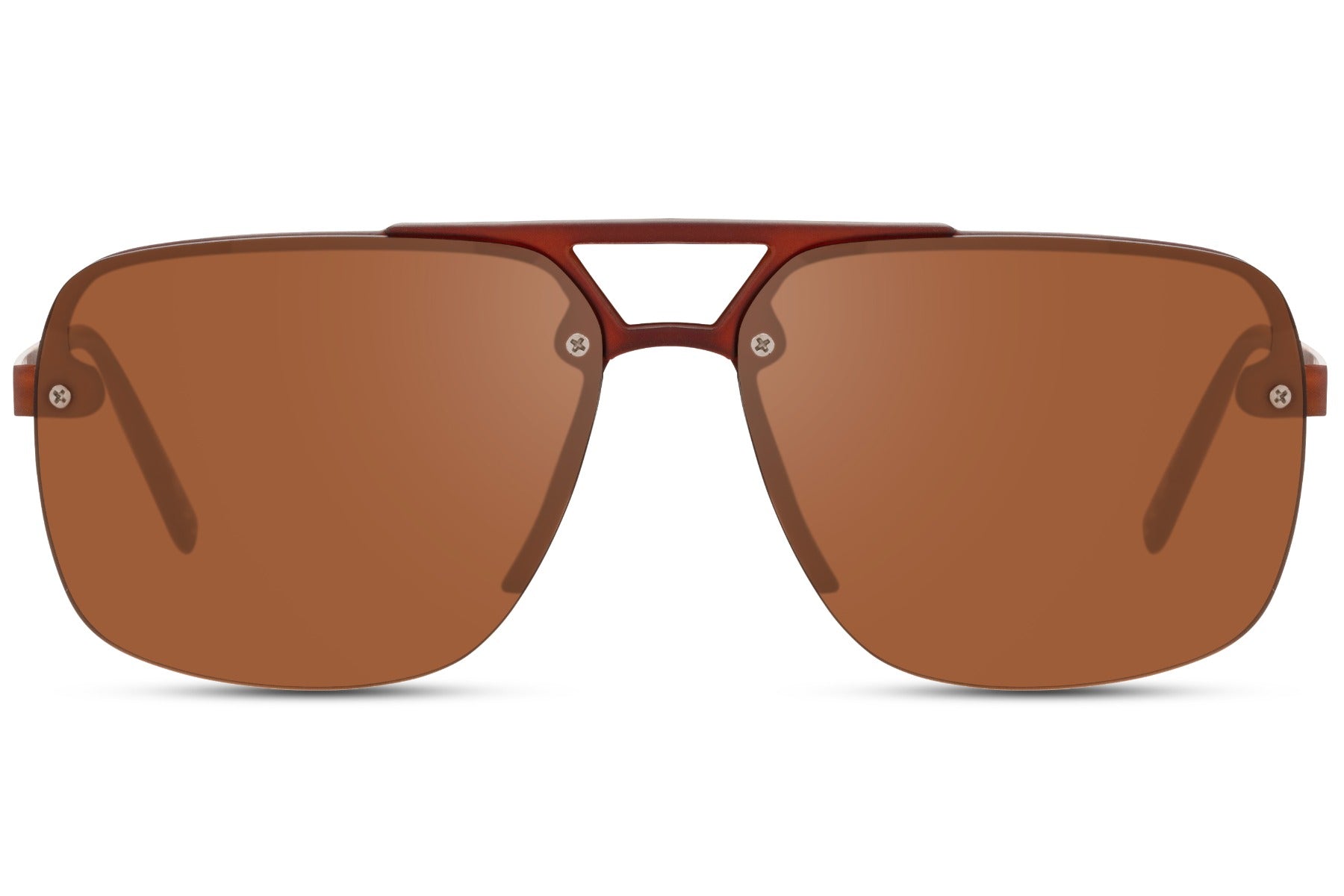 Stoere unisex zonnebril met goudkleurig montuur en bruine glazen.
