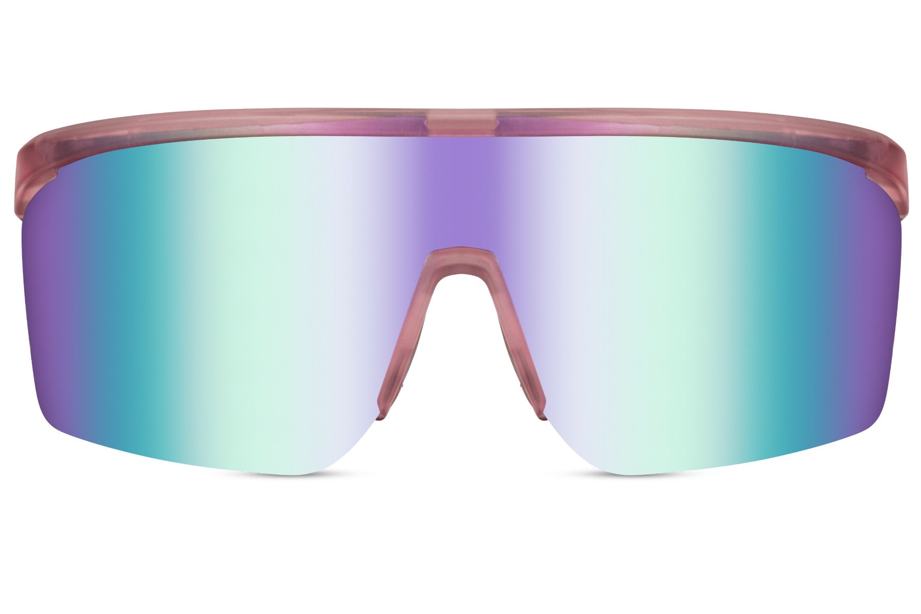 Ga voor een opvallende look met deze roze zonnebril met paarse spiegelglazen. De brede polycarbonaat lenzen (7,5 cm) bieden 100% UV-bescherming (categorie 3) en zijn perfect voor zowel dagelijks gebruik als sportieve activiteiten. Het lichte montuur van gerecycled polyester draagt comfortabel, terwijl de frisse kleuren je outfit een unieke twist geven.