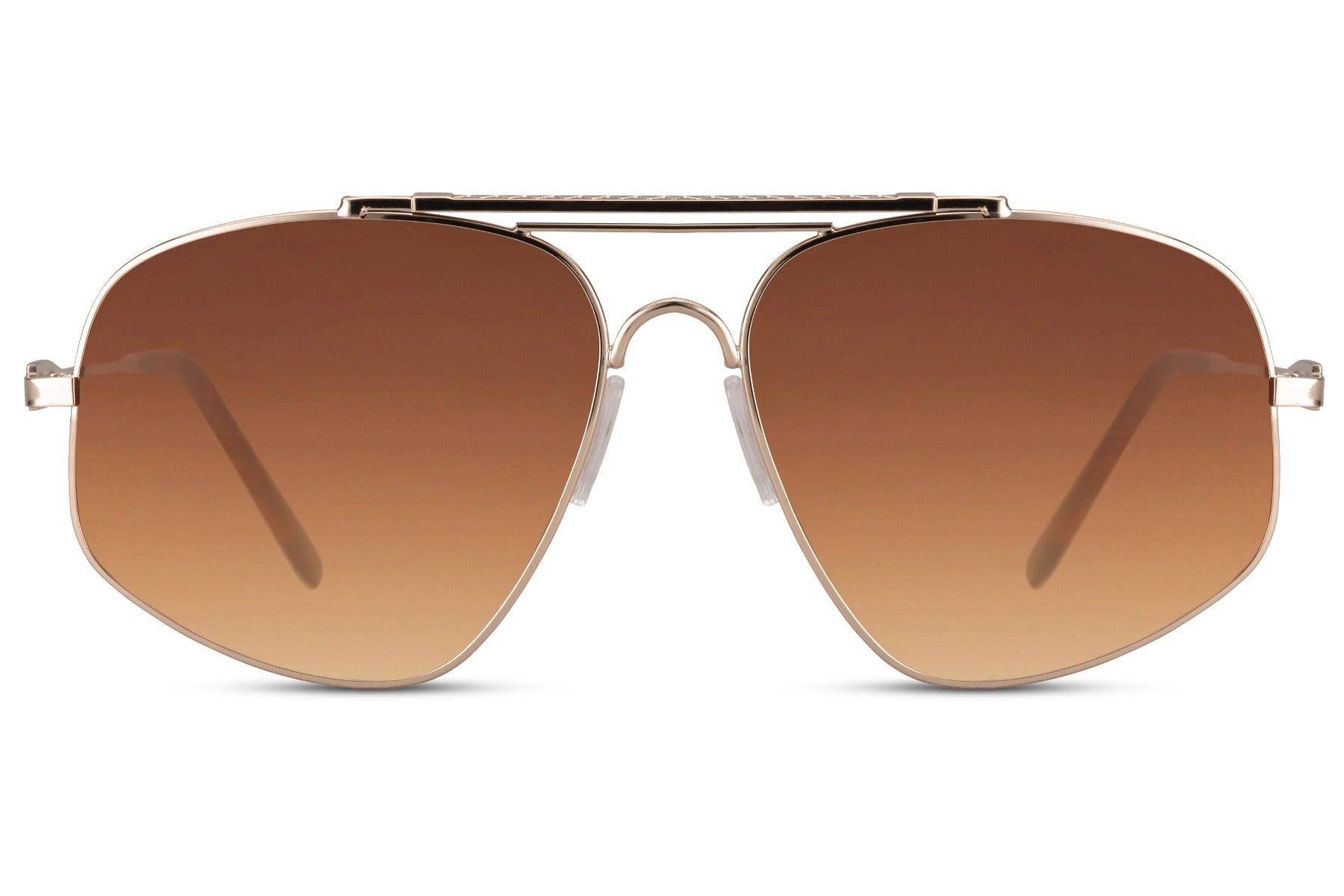 Deze zonnebril met goudkleurig montuur en bruine lenzen combineert tijdloze stijl met modern comfort. Voorzien van 100% UV-bescherming categorie 3 – perfect voor zonnige dagen in stijl.