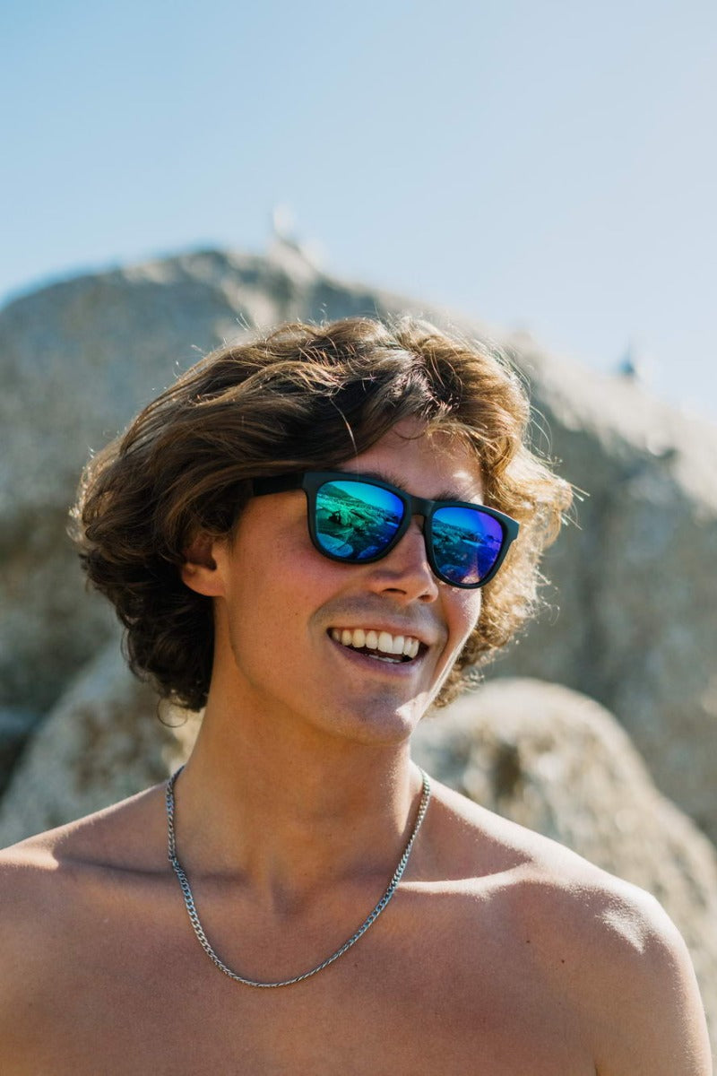 Opvallend en stoer: deze unisex zonnebril met matzwart montuur en felblauwe spiegelglazen geeft je look meteen extra power. 100% UV-bescherming en gemaakt van gerecycled materiaal – stijlvol én verantwoord.