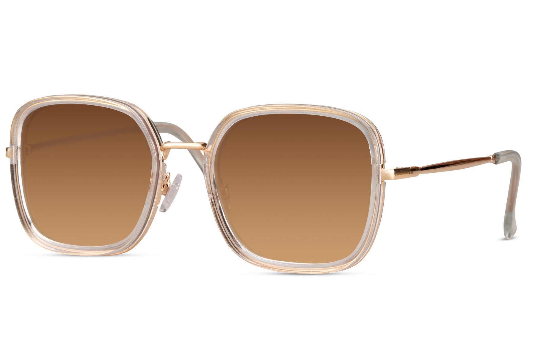 Trendy zonnebril met goudkleurig montuur en bruine lenzen. Voorzien van 100% UV-bescherming (categorie 2) en een comfortabel, lichtgewicht frame van koper & polycarbonaat. Perfect voor een elegante en modieuze look, elke dag opnieuw