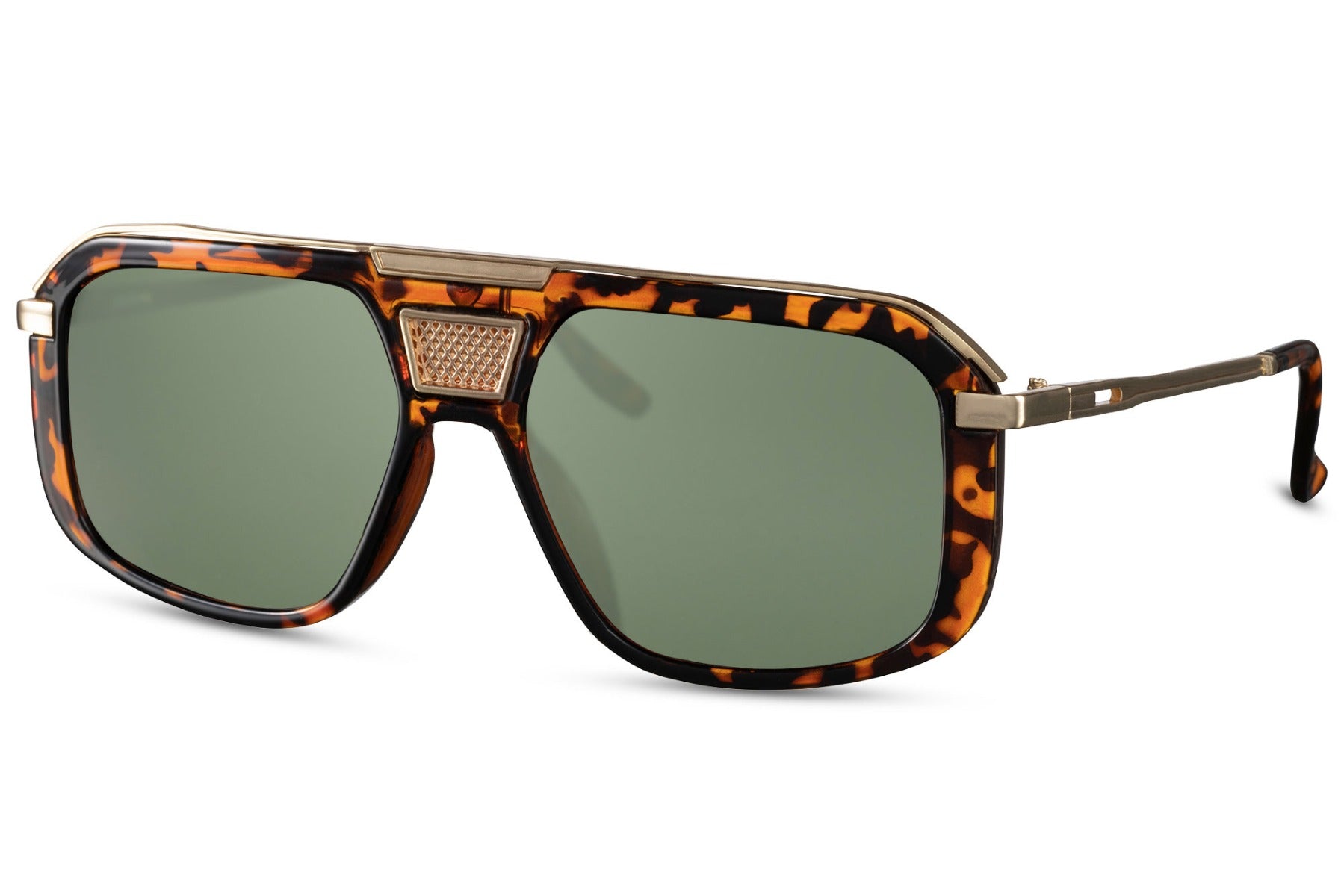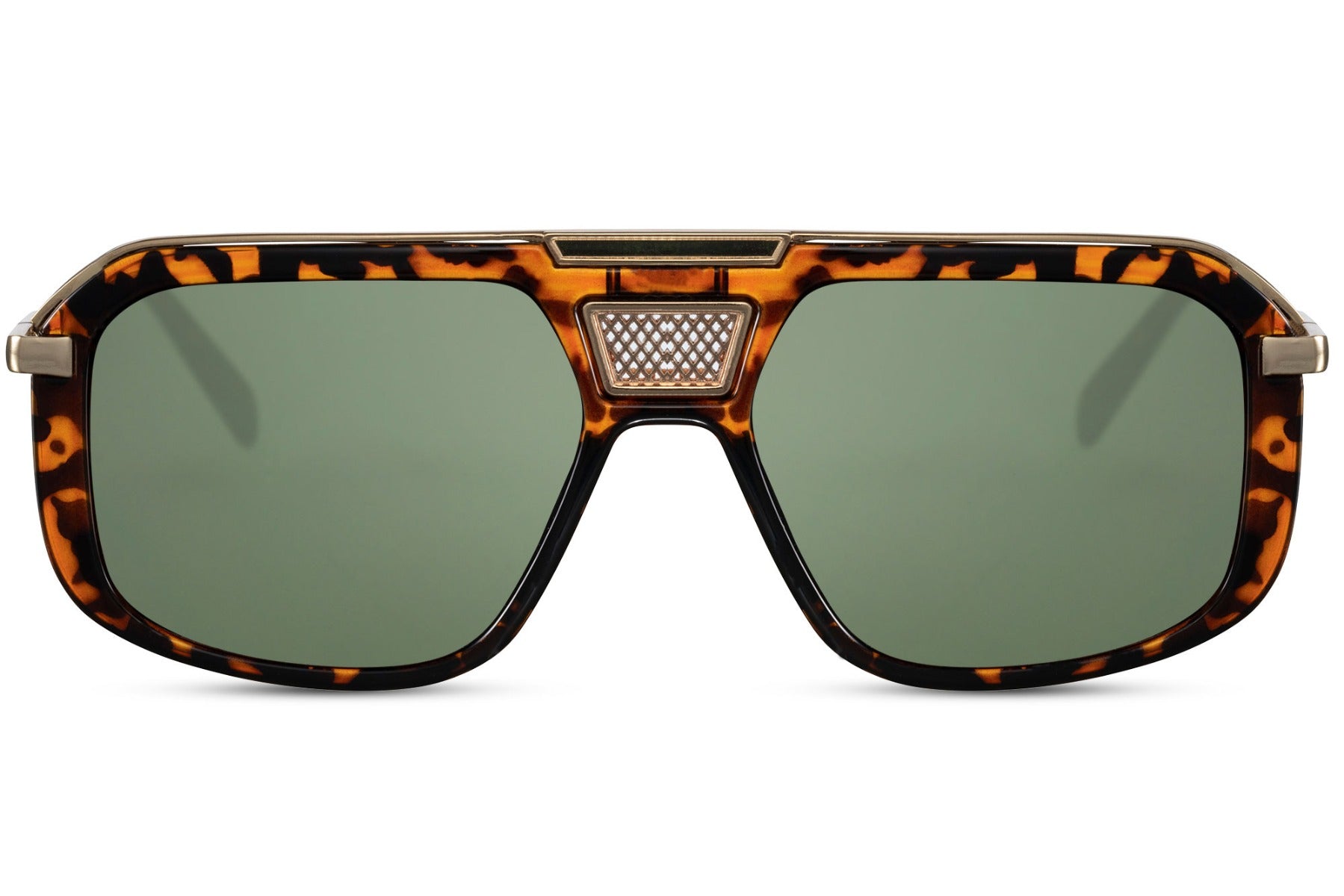 Deze heren zonnebril met bruin montuur en groene glazen is een echte eyecatcher. Het brede frame en unieke detail op de neusbrug geven een krachtige uitstraling. Met 100% UV-bescherming (cat. 3) ben je ook nog eens goed beschermd in de zon. Perfect voor wie houdt van een robuuste look met klasse!