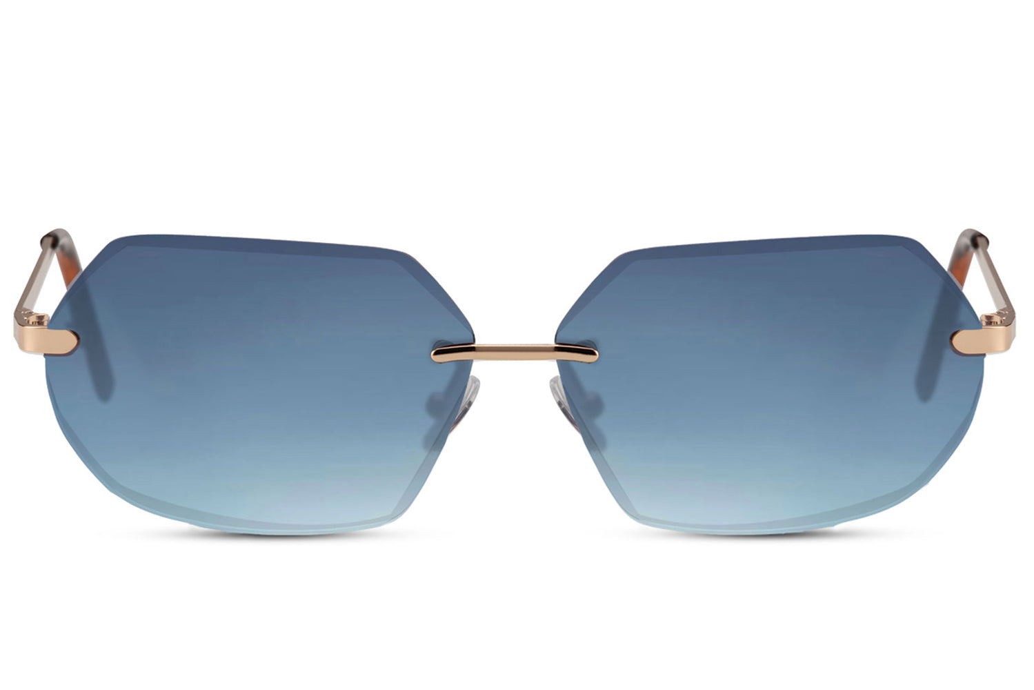 Unisex zonnebril met goud montuur en blauwe lenzen.