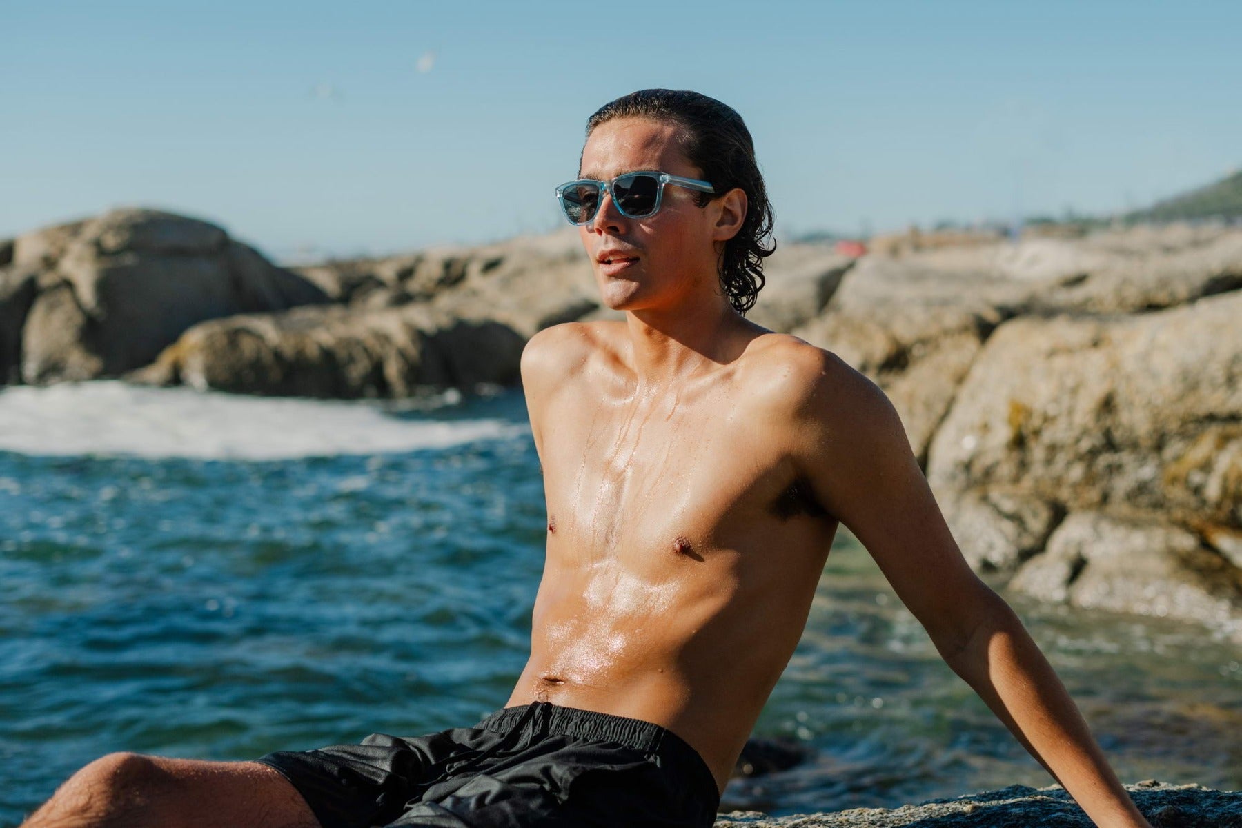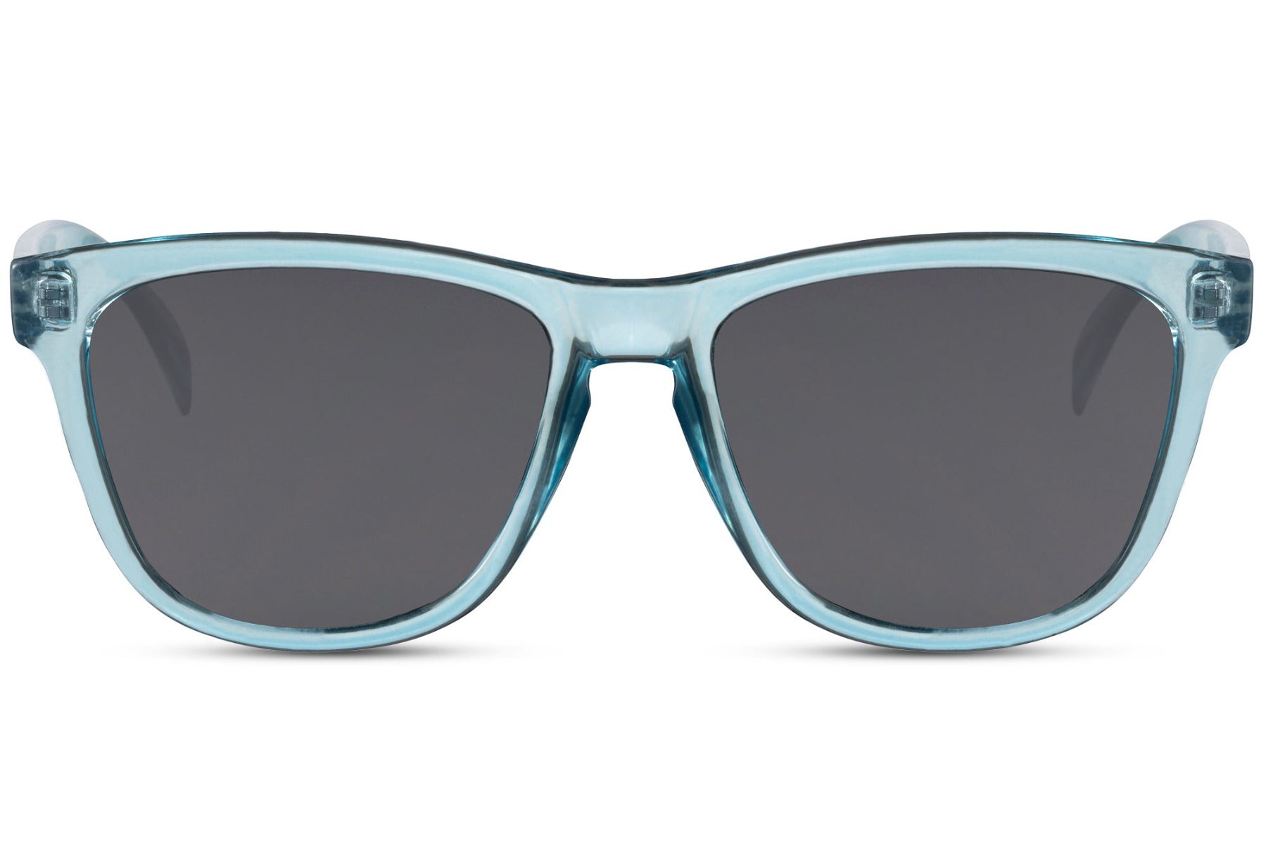 Zomers en stijlvol: deze unisex zonnebril met blauw transparant montuur en zwarte lenzen geeft je outfit een frisse touch. Gemaakt van gerecycled materiaal en voorzien van 100% UV-bescherming (categorie 3).